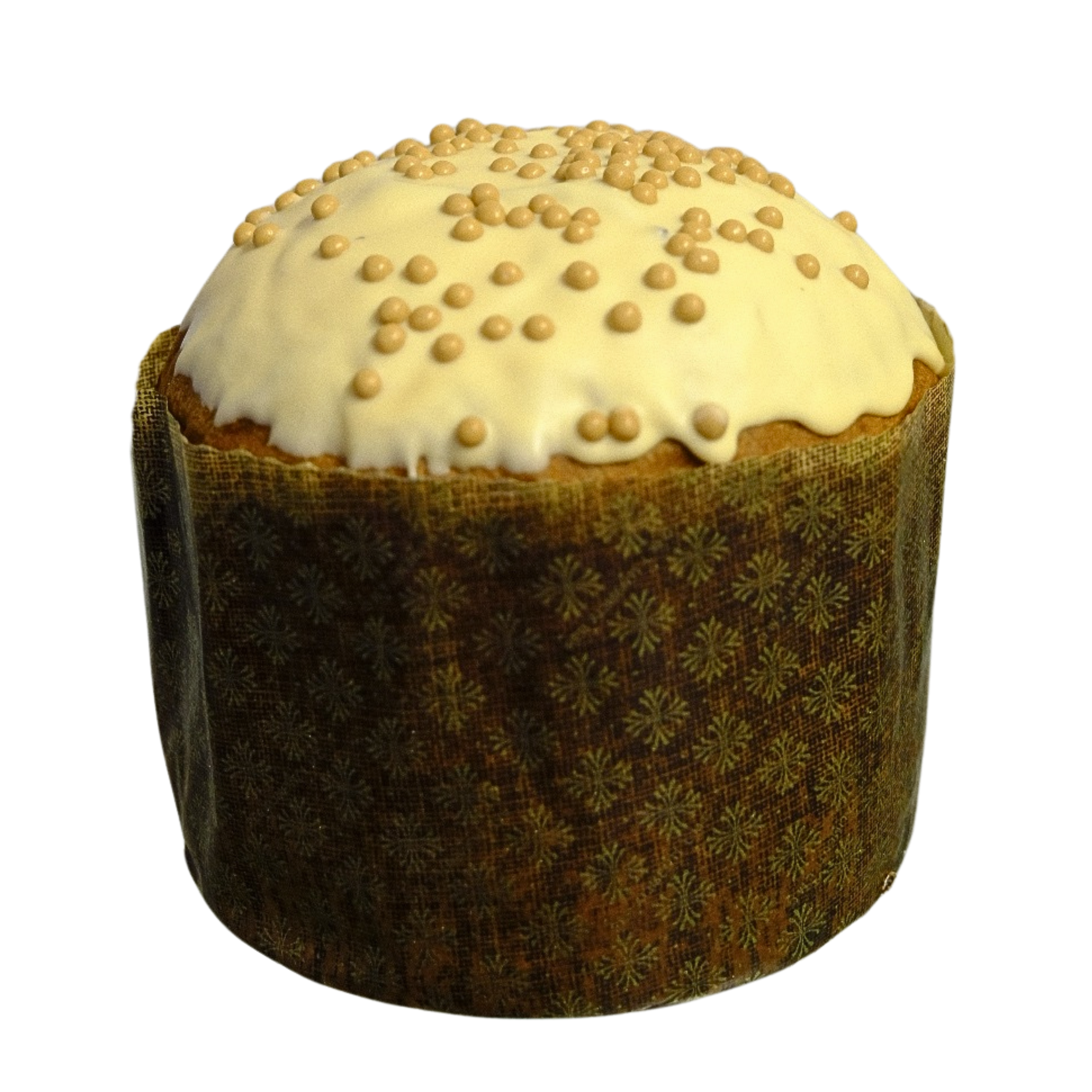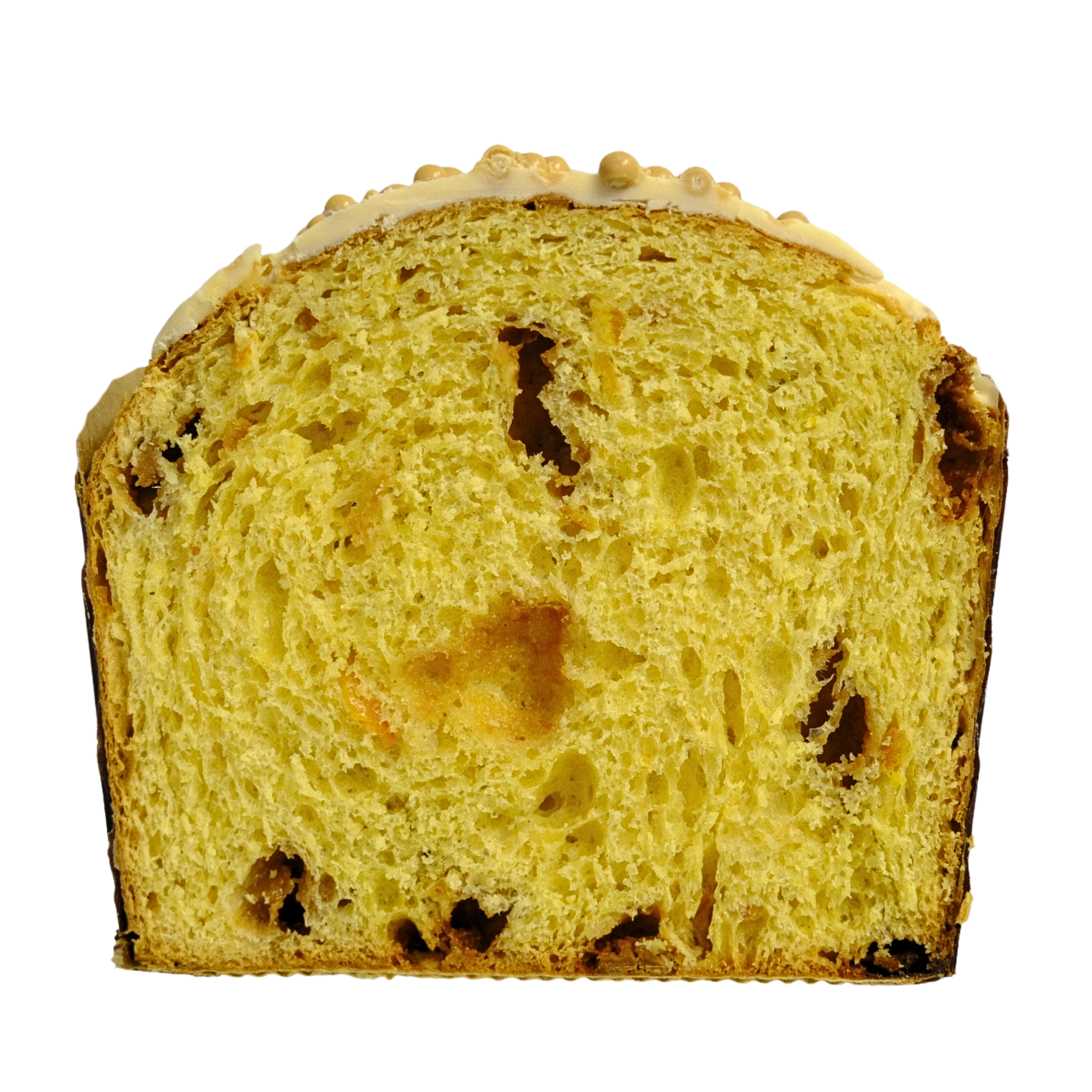 Farina di Frumento, Acqua, Burro, Zucchero, Caramello (sciroppo di glucosio, latte scremato condensato zuccherato, zucchero, acqua, burro di cacao, amido modificato) (8%), Mandarino Tardivo di Ciaculli Semicandito (mandarino tardivo di Ciaculli, saccarosio, sciroppo di glucosio, succo di limone) (7%), Tuorlo d'Uovo, Zucchero, Latte Scremato, Lievito Naturale (farina di frumento, acqua), Aroma di arancia, Aroma di limone, Aroma di vaniglia.